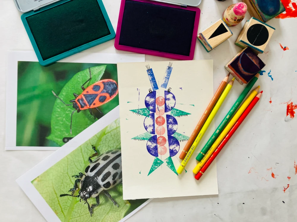 Symmetrie begegnet uns überall – in der Natur, Kunst und Architektur. Ein Blatt, ein Schmetterling, das menschliche Gesicht oder Schneeflocken – all diese Dinge sind oft symmetrisch. Aber warum fasziniert uns Symmetrie so sehr? In diesem Workshop erforschen wir die Symmetrie auf kreative Weise. Wir gestalten fantasievolle Käfer, bei denen wir die Technik der Symmetrie nutzen – durch Stempeln und Malen. Die Körperhälften der Käfer spiegeln sich und ergänzen sich. Mit verschiedenen Farben und Mustern entdecken wir, wie Symmetrie die Ausdruckskraft und Form unserer kleinen Kreaturen beeinflusst. Komm vorbei und erlebe, wie Symmetrie die Welt um uns herum verzaubern kann!